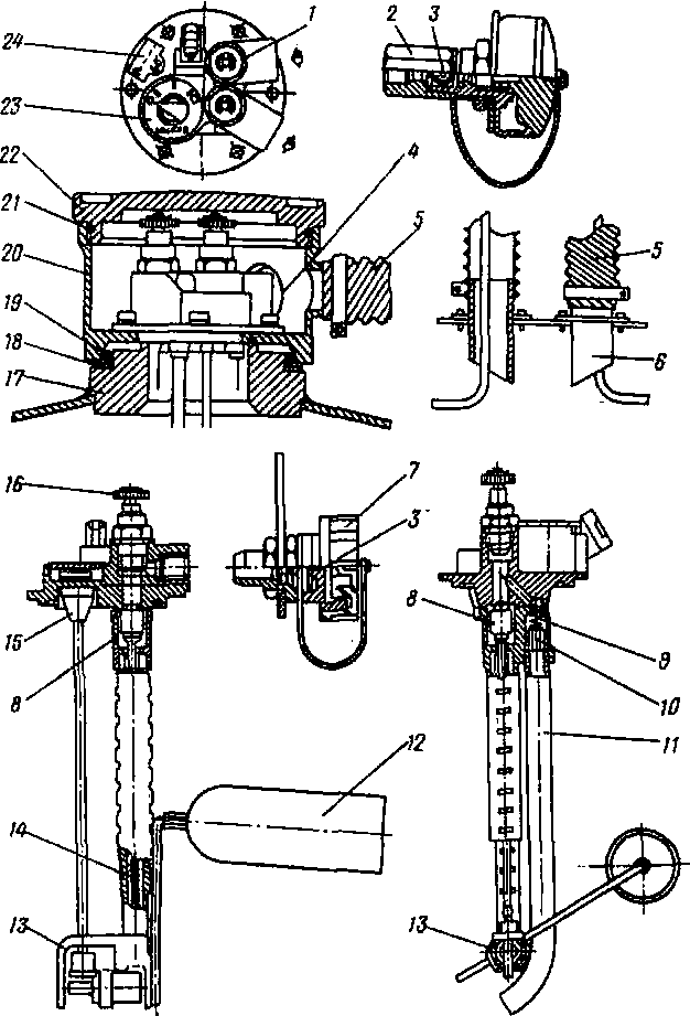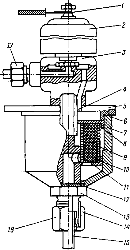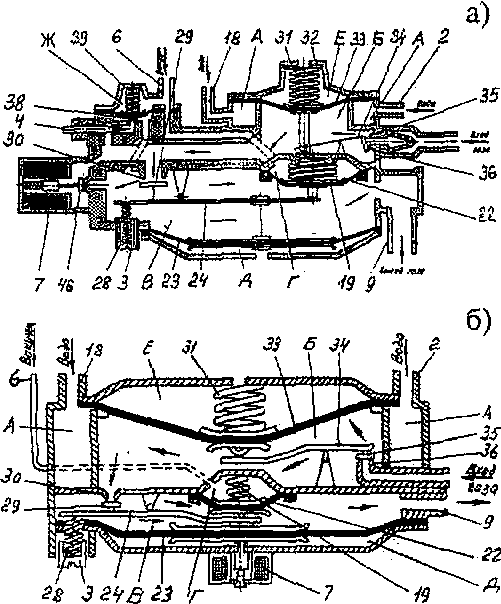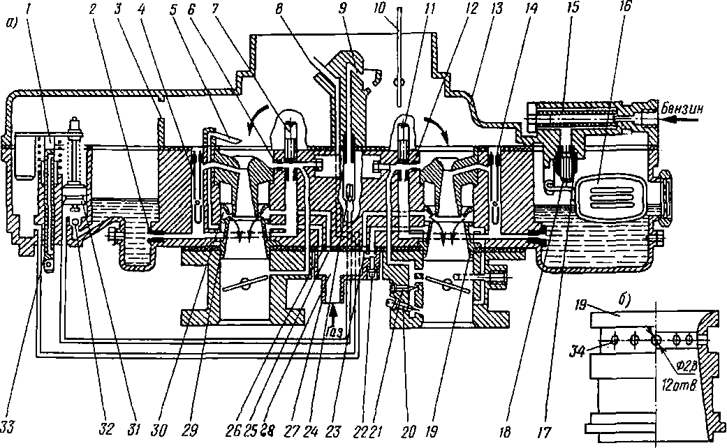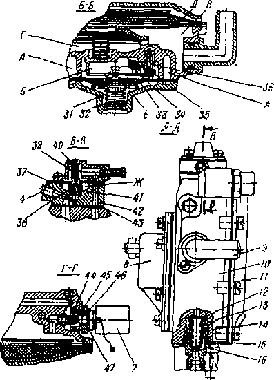 При сборке все детали и корпус должны быть тщательно промыты бензином. Диафрагма не должна иметь повреждений и складок. Вновь установленную диафрагму нужно расположить так, чтобы ее отверстия совпали с отверстиями для винтов. Устанавливая диафрагму, следите, чтобы правильно были вставлены соединительные прорези рычага 14, а сам рычаг слегка наклонен к центру редуктора.