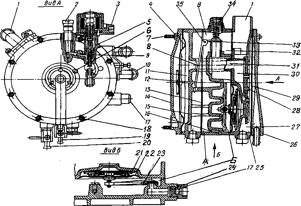 На передней крышке 26 (см. рис. 9) отверните восемь гаек 18 и снимите крышку и диафрагму чувствительности 29. Отверните винт крепления крышки 6 с тремя отверстиями чувствительности 28 и снимите крышку. Отверните два болта, соединяющие корпус системы чувствительности 25 с полостью Б редуктора и снимите этот корпус, пружину 21 и диафрагму 22 первой ступени, сдвинув ее влево от штуцера ввода газа 17 (см. вид Б на рис. 9). Снимите упорное кольцо с втулки канала 9 холостого хода и выньте из него сетчатый фильтр. Вывернув два винта оси рычага 23, снимите рычаг с осью и клапаном. Выверните седло пружины 34 клапана второй ступени.