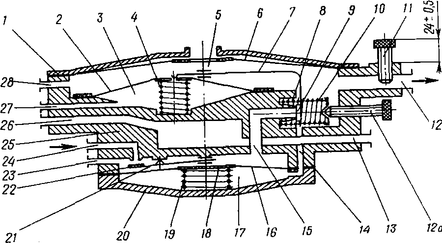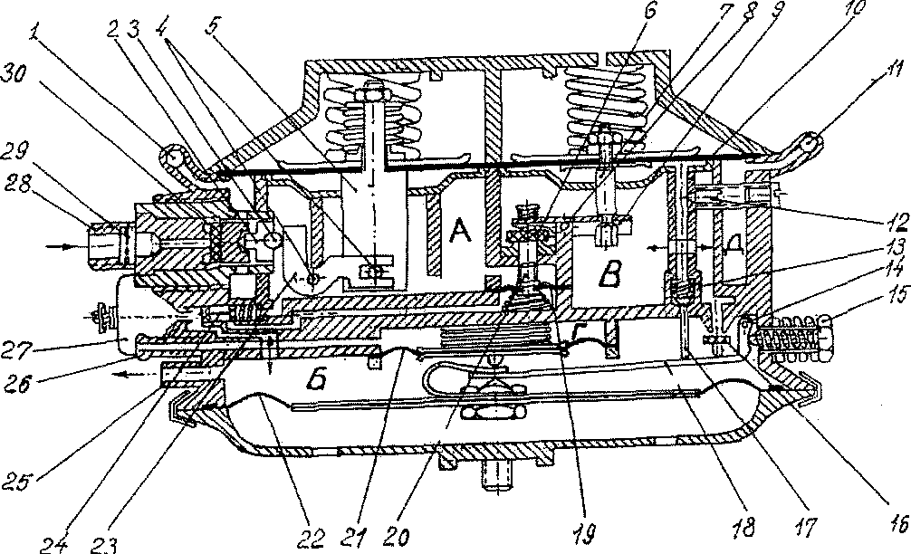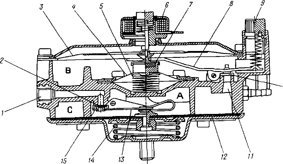 При сборке обратите внимание на сферическую часть заклепки диафрагмы 4, которая должна быть обращена в сторону штока 12, а конец рычага 8 клапана второй ступени на 7 мм должен выступать над торцом полости второй ступени В.