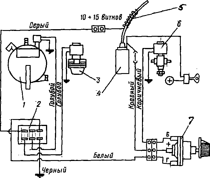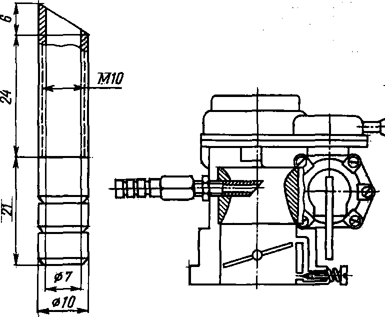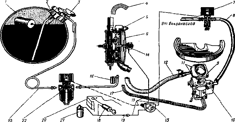 Связь бензонасос — карбюратор осуществляется пластмассовым шлангом от бензонасоса до электромагнитного бензинового клапана 7 и от него шлангом 8 до карбюратора 10.
