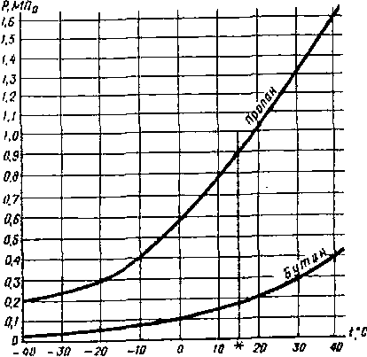 В качестве примера рассмотрим рис. 1. Давление насыщенного пара бутана составляет 0,1 МПа при 0° С и 0,17 МПа при 15° С, а давление насыщенного пара пропана при этих же температурах 0,59 и 0,9 МПа соответственно. Это различие приводит к значительной разнице в давлении смеси при изменении пропорции пропана и бутана. Давление растет при увеличении температуры, что приводит к большим изменениям объема сжиженного газа, находящегося в жидком состоянии. Следовательно, если сжиженный газ в жидком состоянии полностью заполняет баллон и температура продолжает увеличиваться, то давление будет быстро расти, что может привести к разрушению баллона.