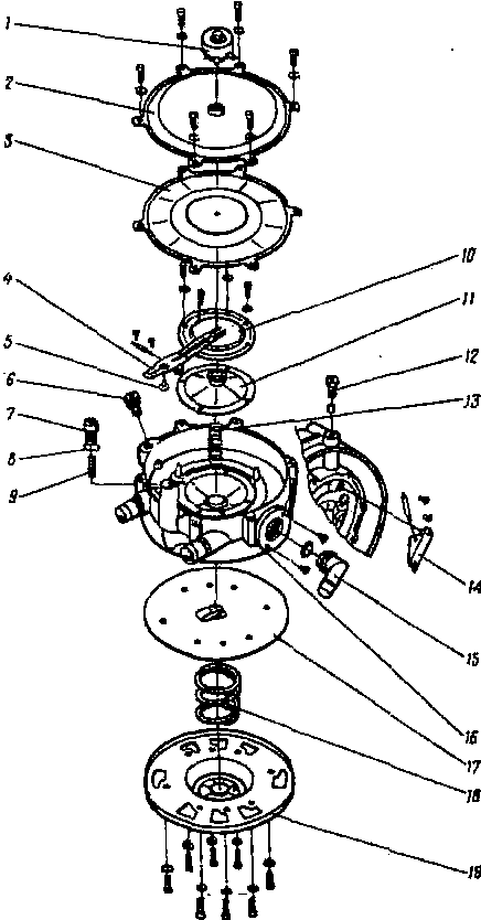 1 - электромагнитный клапан; 2 - крышка второй ступени; 3 - диафрагма второй ступени; 4 - рычаг клапана второй ступени; 5 - опорная прокладка клапана; 6 - пробка слива отстоя; 7 - винт регулировки давления во второй ступени; 8 - уплотнительное резиновое кольцо; 9 -регулировочная пружина второй ступени; 10 -разгрузочное кольцо; 11 - диафрагма разгрузочного устройства; 12 - соединение; 13 - пружина разгрузочного устройства; 14 - рычаг клапана первой ступени; 15 -выходной газовый патрубок; 16 - корпус редуктора; 17 - диафрагма первой ступени; 18 - пружина первой ступени; 19 - крышка первой ступени