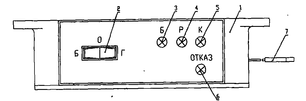 Рис. 32. Электронное устройство: 1 - корпус; 2 - переключатель вида топлива; 3 - светодиод сигнализации о появлении газа в дренажном гофрированном шланге багажного отделения; 4 - светодиод сигнализации о появлении газа в дренажном шланге редуктора высокого давления; 5 - светодиод сигнализации о появлении газа в дренажном шланге газового электромагнитного клапана; 6 - светодиод автоматического встроенного контроля исправности электронного устройства; 7 - электрические разъемы