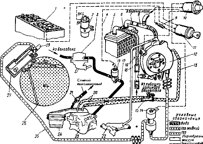 Сжиженный нефтяной газ под давлением 1,6 МПа (16 кгс/см2) из баллона 26 по гибкому газопроводу высокого давления 25 поступает в газовый фильтр, где подвергается очистке от смолистых веществ и механических примесей. Далее очищенный газ 'по трубопроводу проходит в первую ступень двухступенчатого редуктора-испарителя 12, где давление понижается до 0,2 МПа, а затем во вторую ступень, где оно понижается до значения, близкого к атмосферному. Под действием разрежения, создаваемого в коллекторе 22 работающего двигателя, газ из полости второй ступени редуктора-испарителя поступает в дозирующее устройство и по шлангу низкого давления через тройник-дозатор 15 поступает в карбюратор 23 через смесительное устройство (проставку) или со стороны фланца (воздушной заслонки) через два газоподводящих патрубка 20, впаянных в переходную коробку воздушного фильтра 24. После смешения газа с воздухом образуется однородная горючая смесь, которая поступает в цилиндры двигателя.