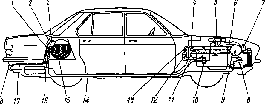 Для подогрева и испарения газа в редукторе разрезают шланг, соединяющий отопитель салона с водяным насосом охлаждающей системы двигателя, и устанавливают соединительный тройник. Теплую воду подводят по шлангу 16 к нижнему патрубку редуктора, ибо теплая вода должна втекать в редуктор снизу. К верхнему патрубку отвода воды из редуктора присоединяют шланг 4 и направляют его к штуцеру водяного насоса.