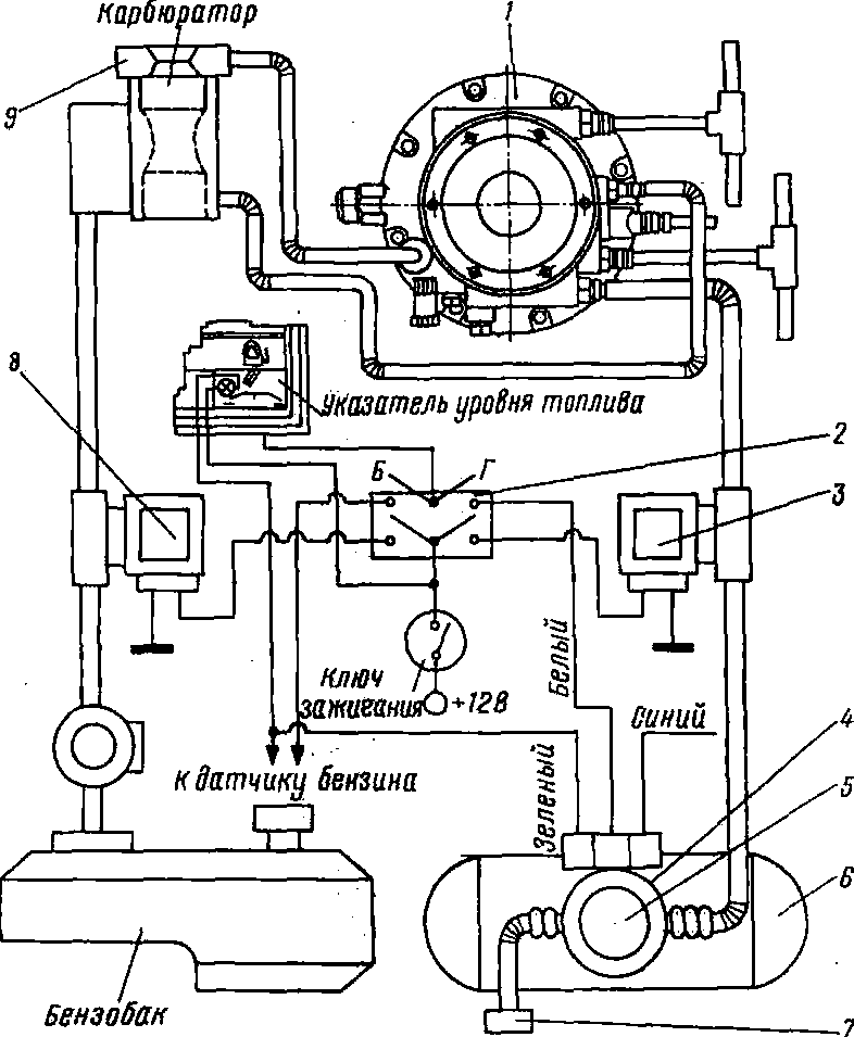 Принцип работы электрической системы газобаллонной установки следующий. В системе питания двигателя, работающего на универсальном топливе, имеются два электромагнитных клапана. Клапан 19 предназначен для отключения подачи бензина при работе двигателя на газе, а клапан 14 — для отключения подачи газа при работе на бензине. Переключатель вида топлива 10 установлен в удобном месте под щитком приборов и подключен через замок зажигания к электрической цепи катушки зажигания 2 (клемма ВК), включаемой замком зажигания 11. Электрическая цепь 4 может работать только при включенном зажигании.